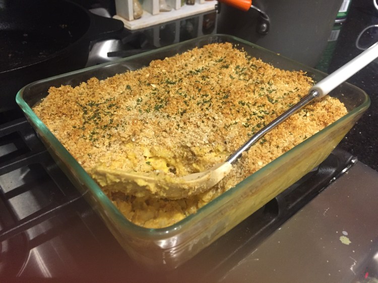 - Bake for 20 minutes until the breadcrumbs brown and crisp.