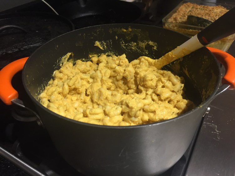 - Add the nutritional yeast, turmeric, salt, paprika, and garlic powder. Continue to cook for about a minute while stirring constantly. This should make a thick paste/roux. *Picture below*